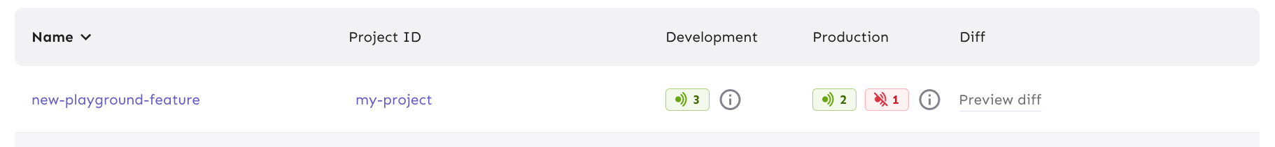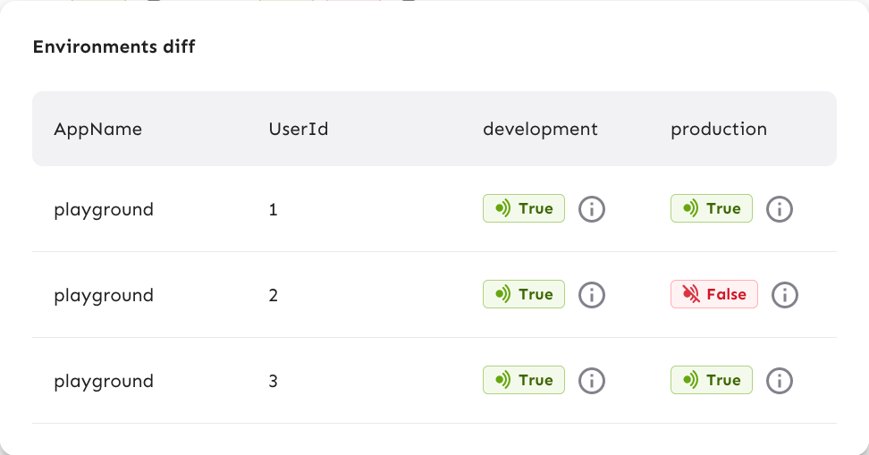 You can compare how a feature evaluates in different environments. If you select more than one environment for your playground query, the table will have an additional "Diff" column in each row. Using the "preview diff" button, you can open a table that gives an overview over how the feature evaluated for each context combination in each environment.